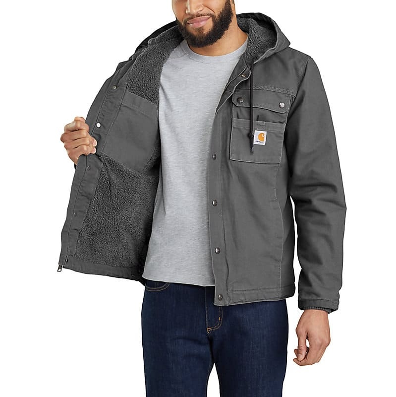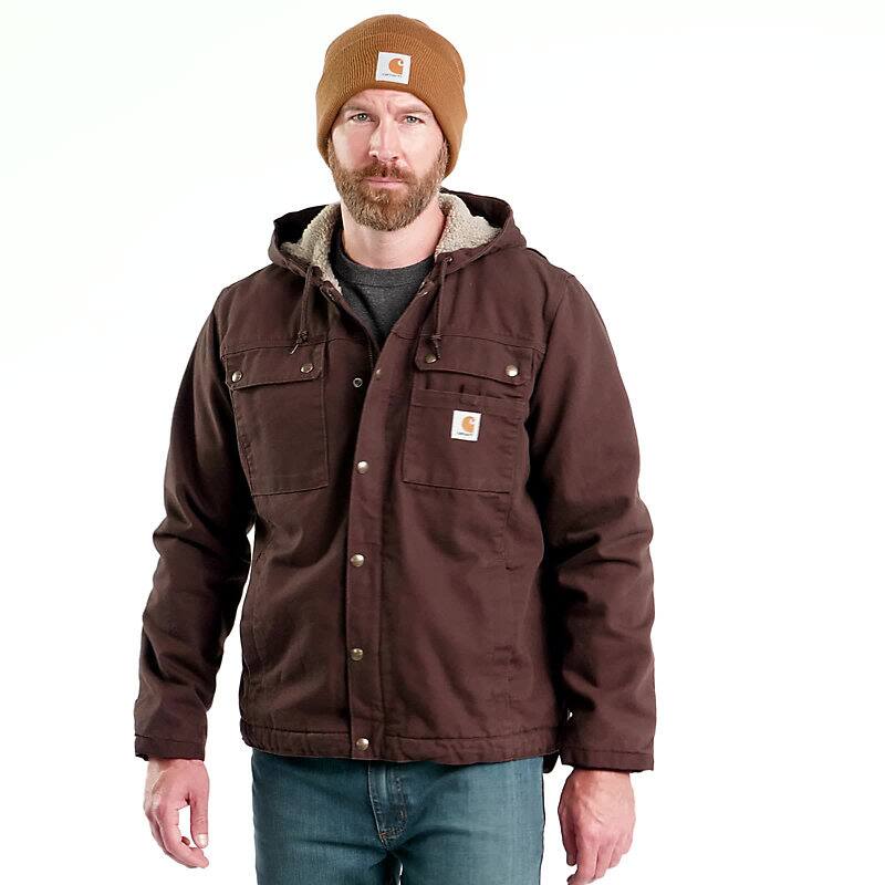 Engineered For midrange warmth in moderately cold conditions, this men's sherpa-lined jacket is built to endure cold, wind, and tough days on the job. Rugged without being rigid, it's made with durable cotton duck and is reinforced with Cordura® at wear points along the cuffs. This warm layer is lined with soft sherpa fleece through the body and hood, with warm quilted nylon through the sleeves. Generous pockets inside and out provide plenty of on-the-go storage options. Previously known as the Washed Duck Bartlett Jacket.