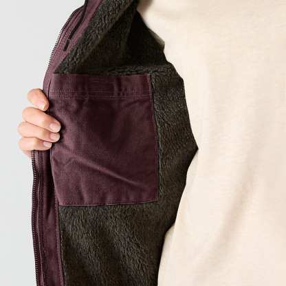 - Sherpa-lined body for warmth; Quilted nylon sleeve lining for warmth and easy on-and-off