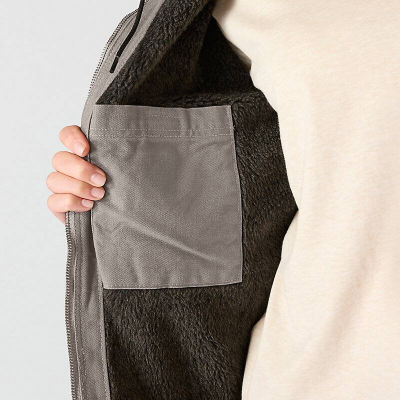 - Attached sherpa-lined hood with hidden drawcord