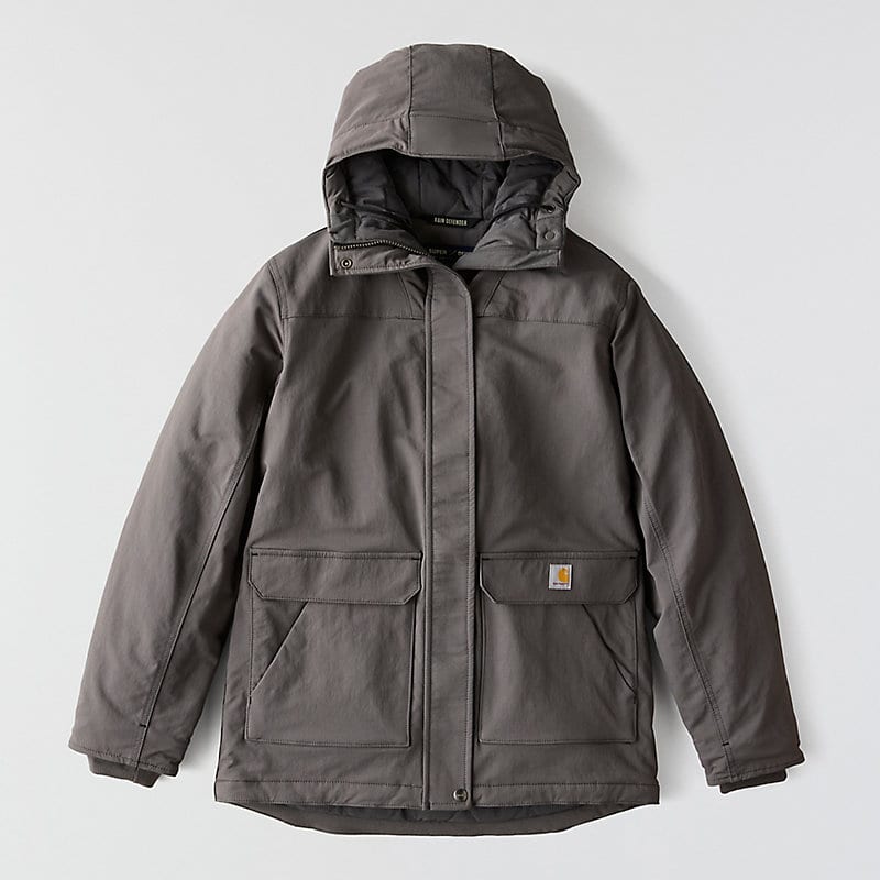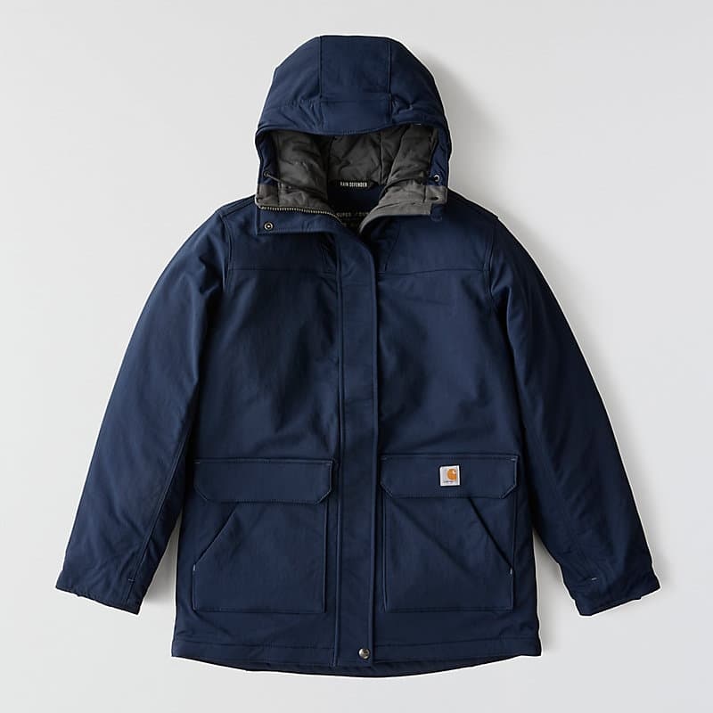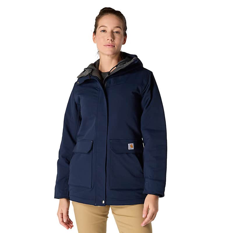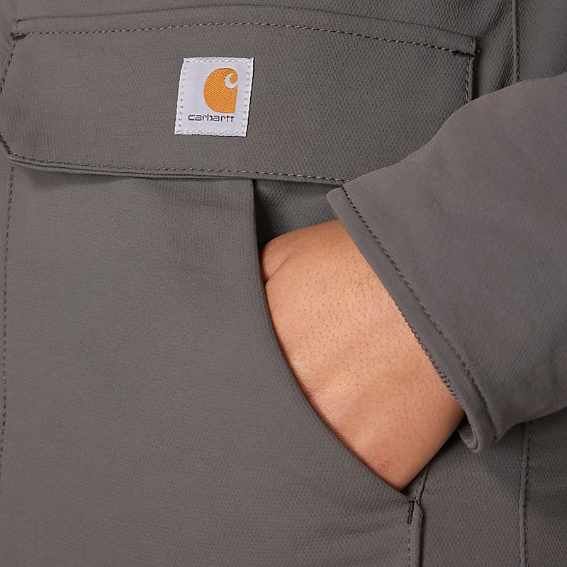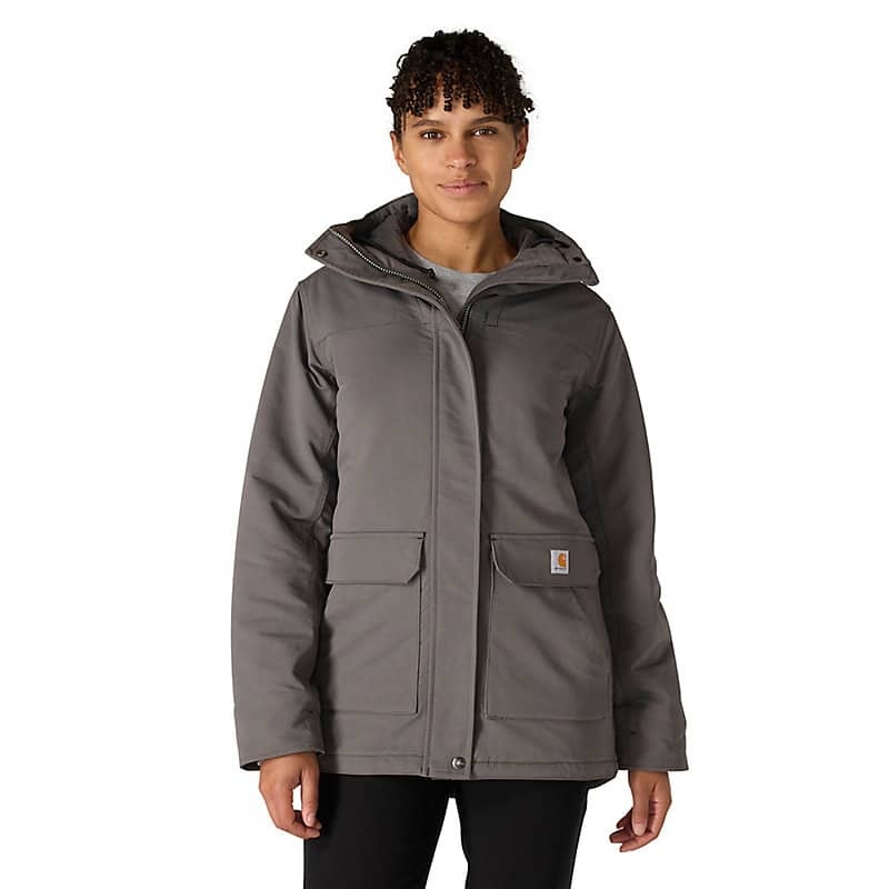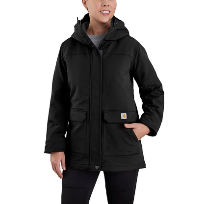 Carhartt has been working hard since 1889 to insure you have the best gear out there to get the job done. This women's jacket is made of durable nylon with built in stretch for easy movement. The water-resistant build protects against light rain and wind, while 100-gram insulation provides warmth without adding bulk.