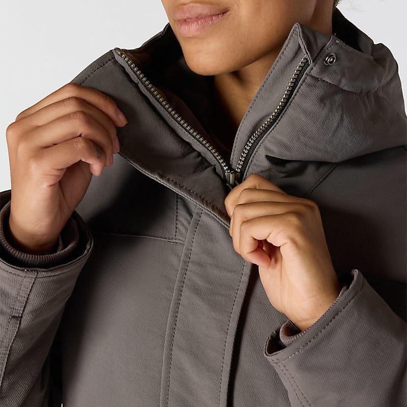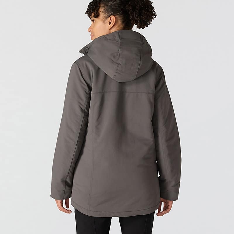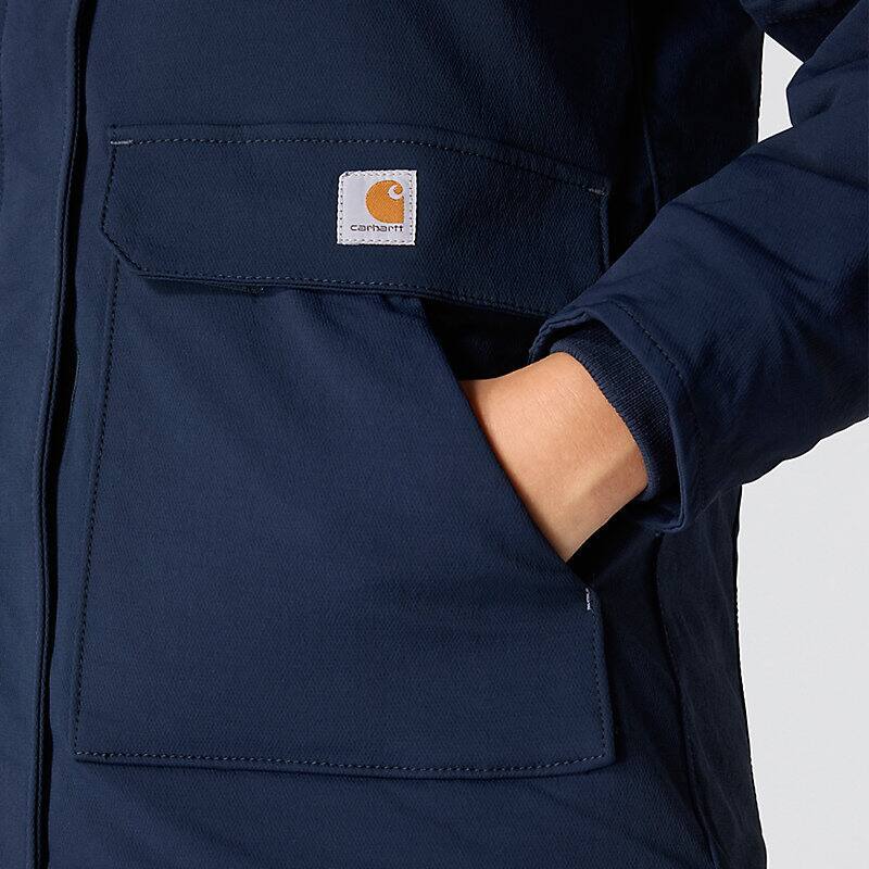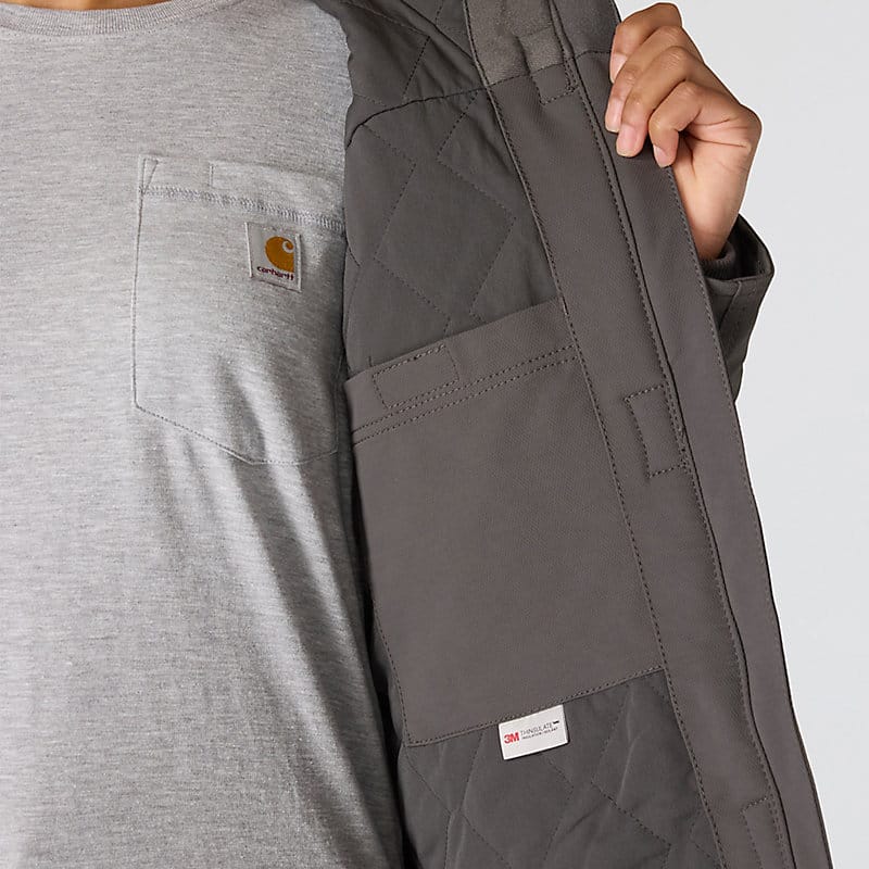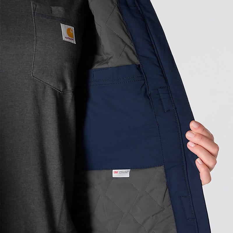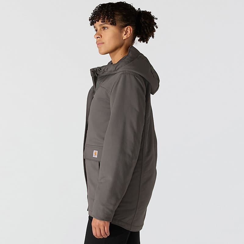 Carhartt has been working hard since 1889 to insure you have the best gear out there to get the job done. This women's jacket is made of durable nylon with built in stretch for easy movement. The water-resistant build protects against light rain and wind, while 100-gram insulation provides warmth without adding bulk.