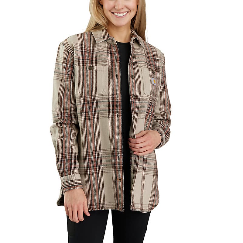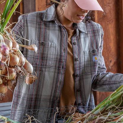Whether you spend your days working in the shop or doing chores around the farm, this women's Carhartt twill plaid shirt has a heavyweight feel and a soft touch. It's durable enough for rugged work and comfortable enough for routine wear. A loose fit makes for easy layering with plenty of room to move and multiple pockets add everyday utility.