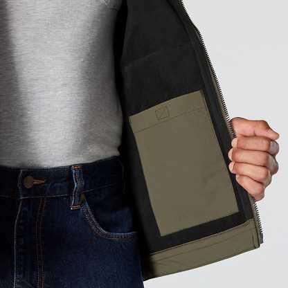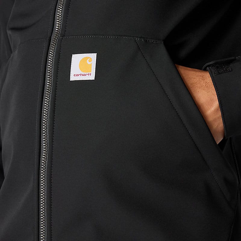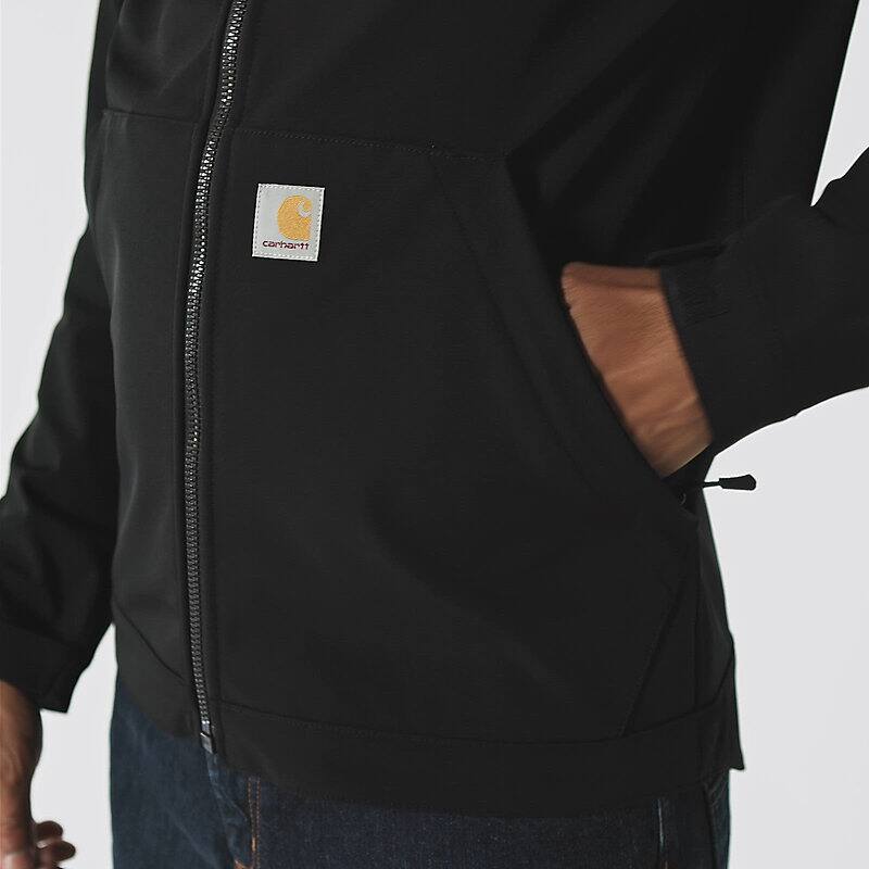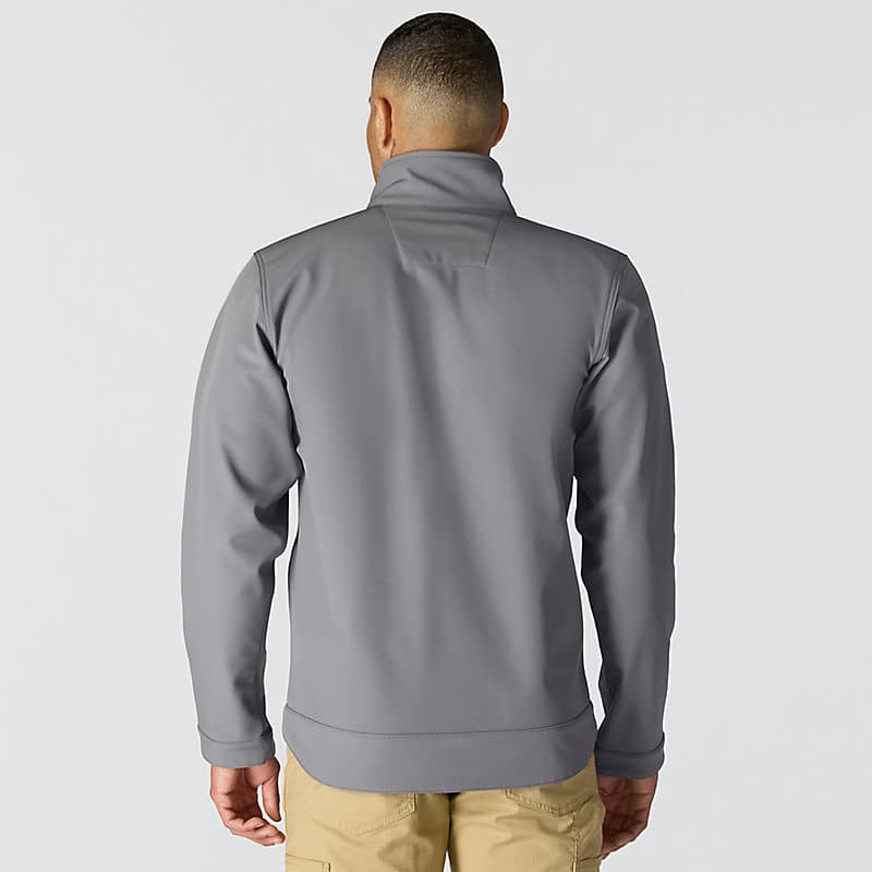 Keep working through gray, cloudy days in this men's softshell water-resistant jacket. It's made to repel light rain and fight off gusts of wind. It has built-in flex so you can move without restriction, and a mock-neck collar for a little extra coverage. A relaxed fit gives you room to move.