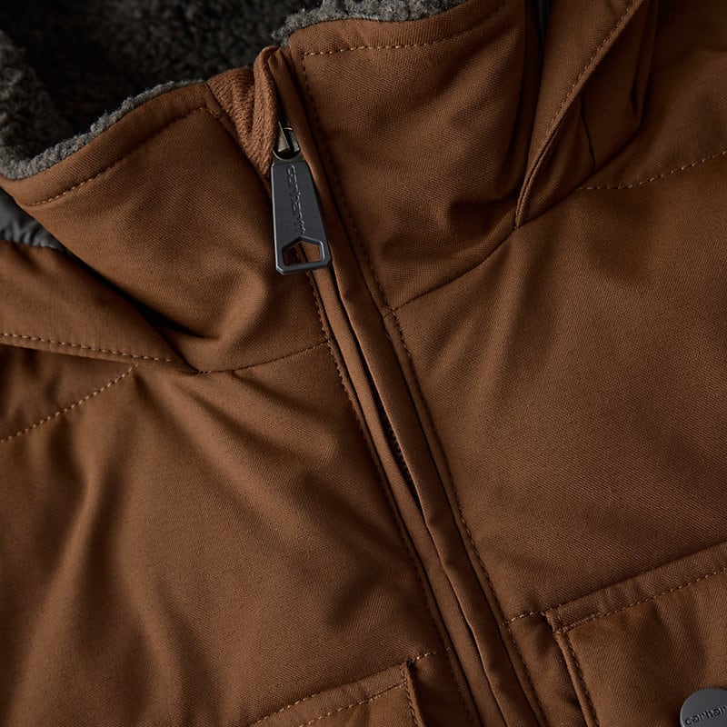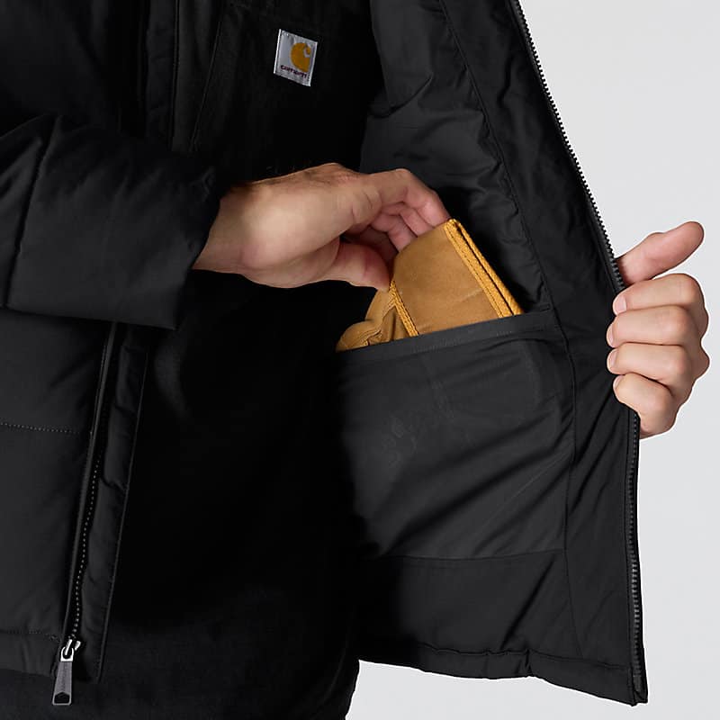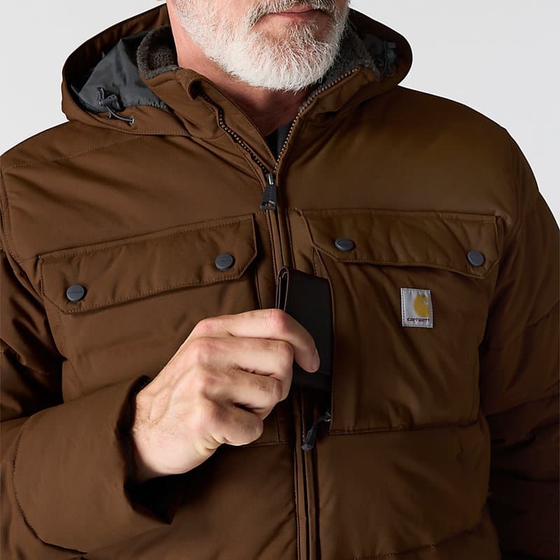 Built for the coldest days on the job, this men's puffer jacket blocks the wind, sheds moisture, and warms your core with a combination of sherpa fleece and synthetic down insulation. Pockets inside and out offer plenty of storage. A loose fit allows for easy layering and movement.
