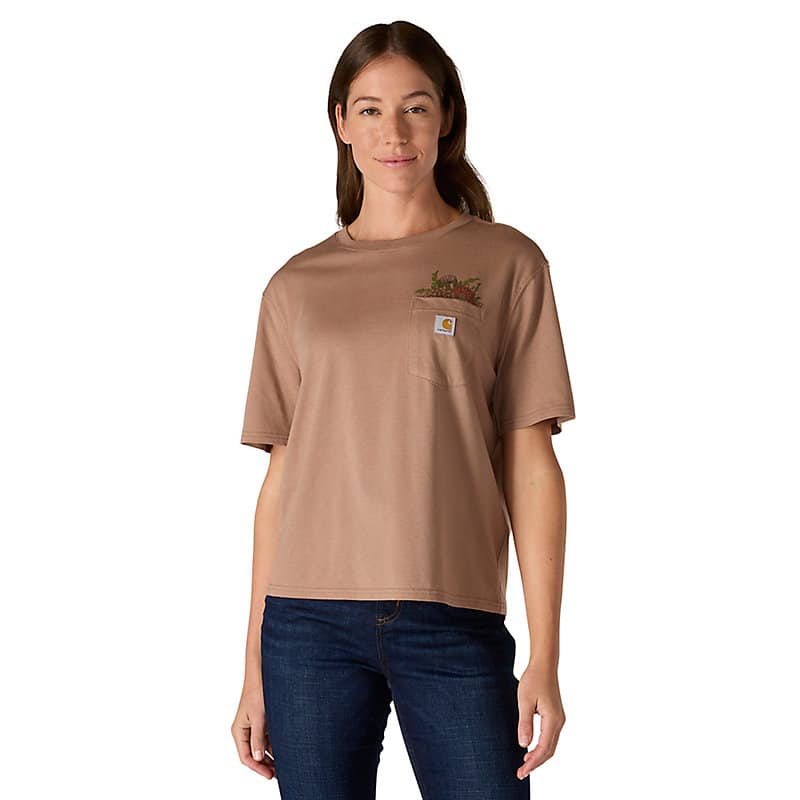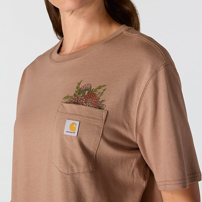 Cut for a loose fit with extra room to move, this women's TENCEL™ Fiber Series shirt features an extra soft cotton blend. A flower graphic on the pocket adds a casual touch.