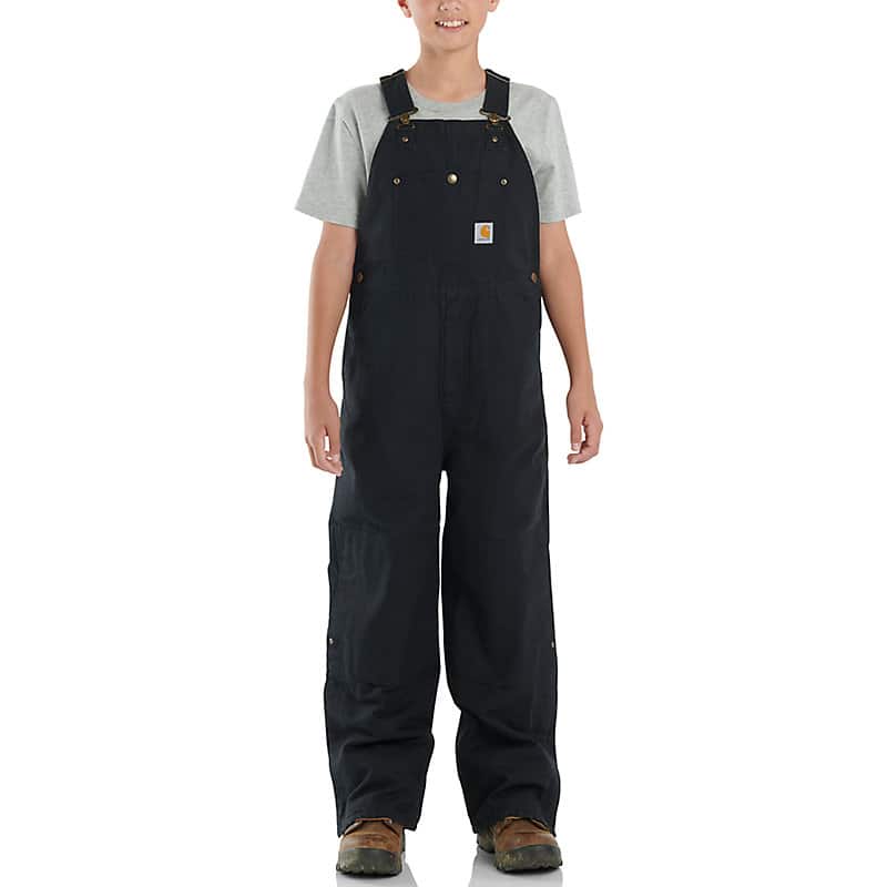 Hard-wearing gear for hardworking kids. Made Carhartt tough from rugged cotton canvas, these kids' triple-stitched washed bib overalls are built to handle every job. They have a quilted lining for added comfort, plenty of pockets, leg zips, and shoulder straps that adjust as boys grow.