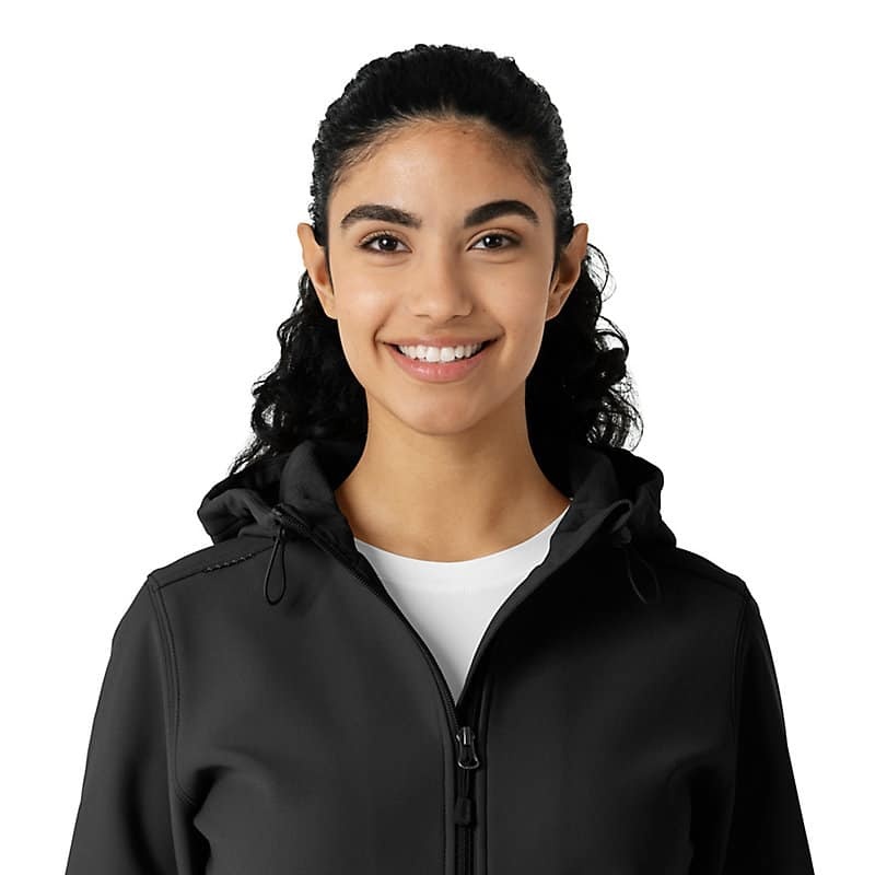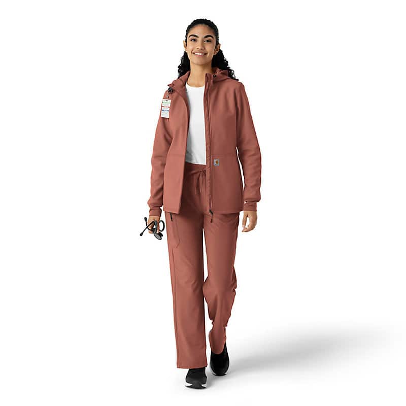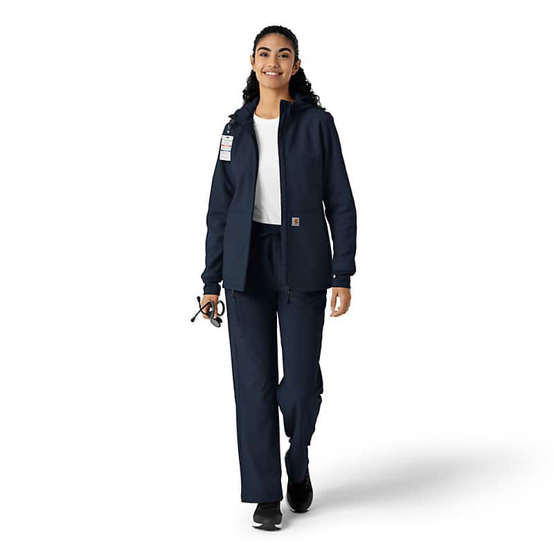 Stay cozy and confident with the Carhartt Women's Bonded Fleece Hoodie, designed for warmth and style as you move between chilly environments. Crafted from soft bonded fleece, this full-zip hoodie features a chin guard to prevent chafing and a three-piece hood with a drawcord for a snug fit. Two front handwarmer pockets with flaps and an internal stethoscope pocket offer practicality, while fitted knit cuffs make it easy to slide on gloves. The slightly longer back curved hem ensures a flattering fit. Embrace warmth and functionality during your busy workday with this essential hoodie!