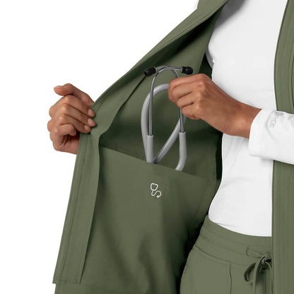 - One secure zip pocket, one top loading chest pocket with pen slot, two hand pockets with one pen slot, one internal stethoscope pocket
