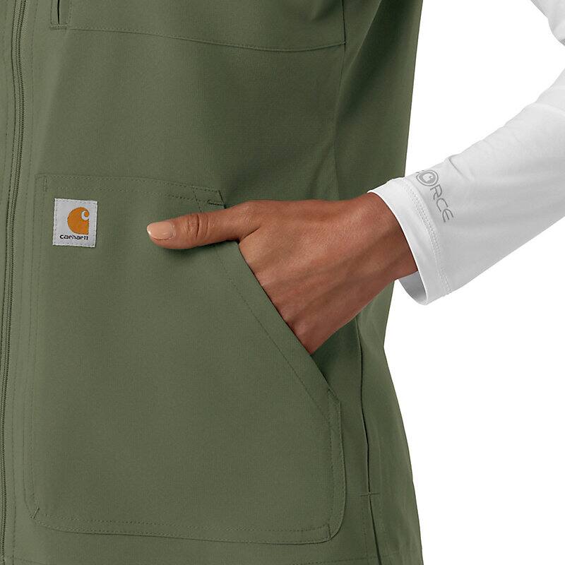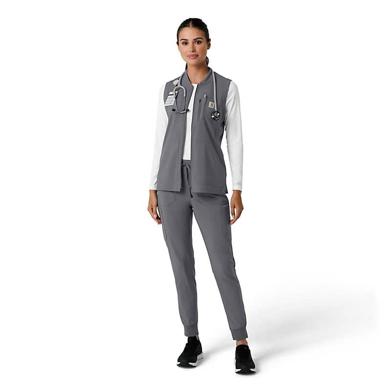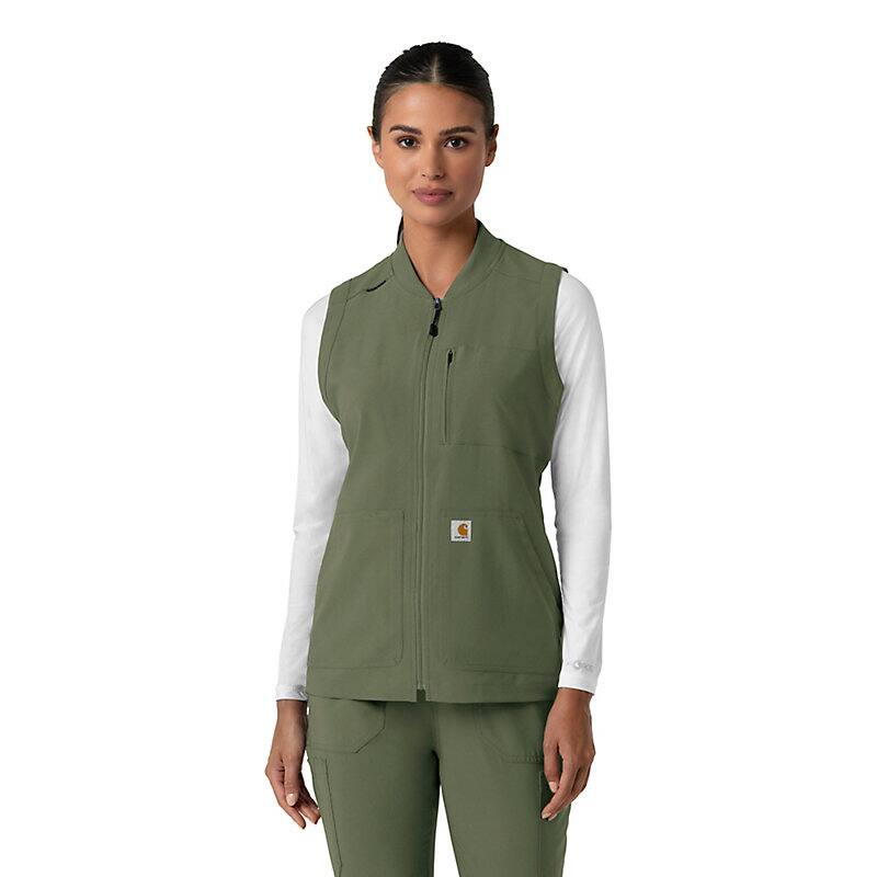 This women's Carhartt scrub vest is designed for the active healthcare professional who values practicality and performance. Built to handle the demands of a busy workday, this vest prioritizes utility and functionality. Utilizing Rugged Flex™ stretch technology, it provides exceptional flexibility, allowing for unrestricted movement during demanding tasks. A key feature is the mesh-lined back vent, which promotes airflow and helps regulate body temperature, keeping you cool and comfortable throughout your shift. The vest is equipped with ample pockets, strategically placed to safeguard all your essential notes, supplies, and personal items. Notably, a dedicated space is provided for your stethoscope, ensuring this crucial tool is always readily accessible. This scrub vest is more than just an outer layer; it's a functional tool designed to enhance your efficiency and comfort. The durable construction and thoughtful design div make it a reliable choice for professionals who need a vest that can keep up with their demanding schedules. It's an ideal addition to any healthcare professional's wardrobe, providing both practicality and comfort.