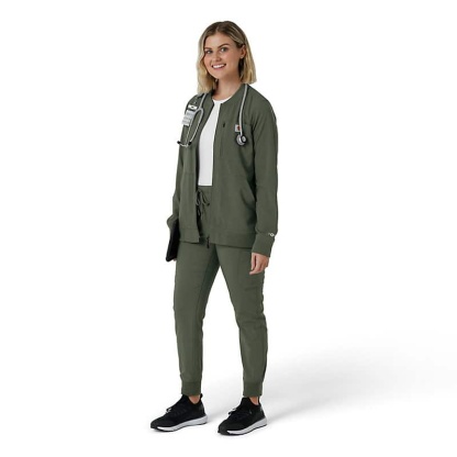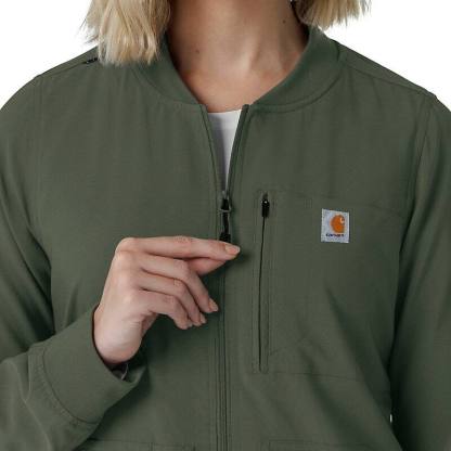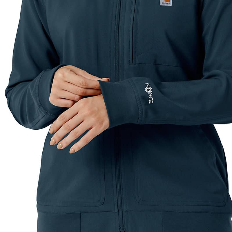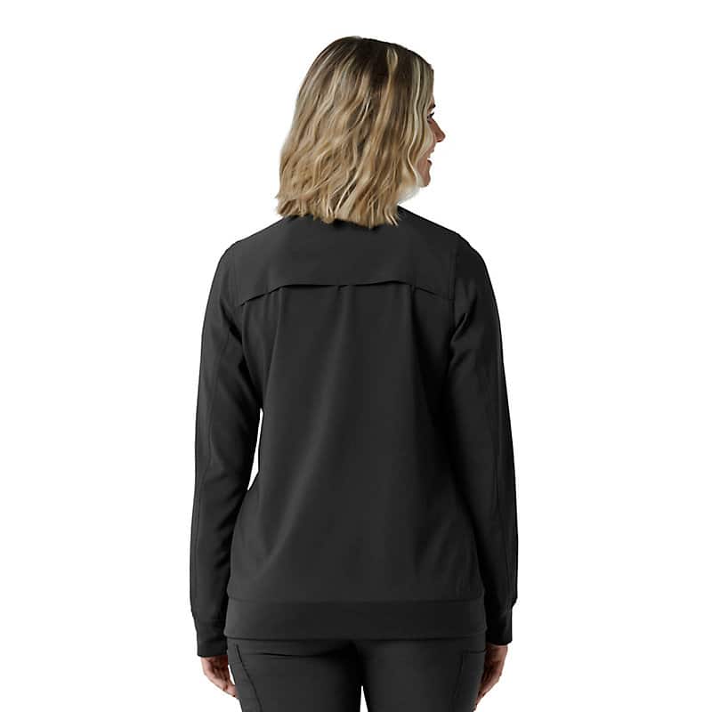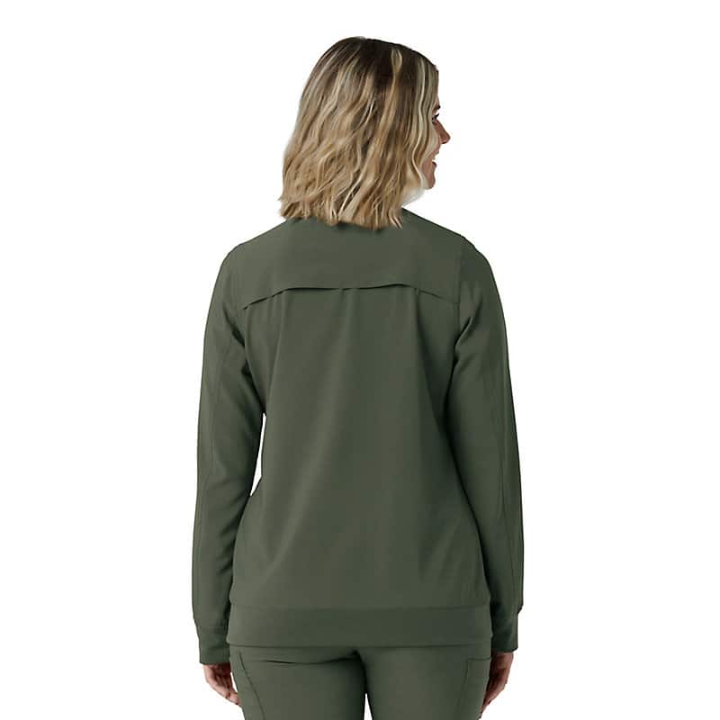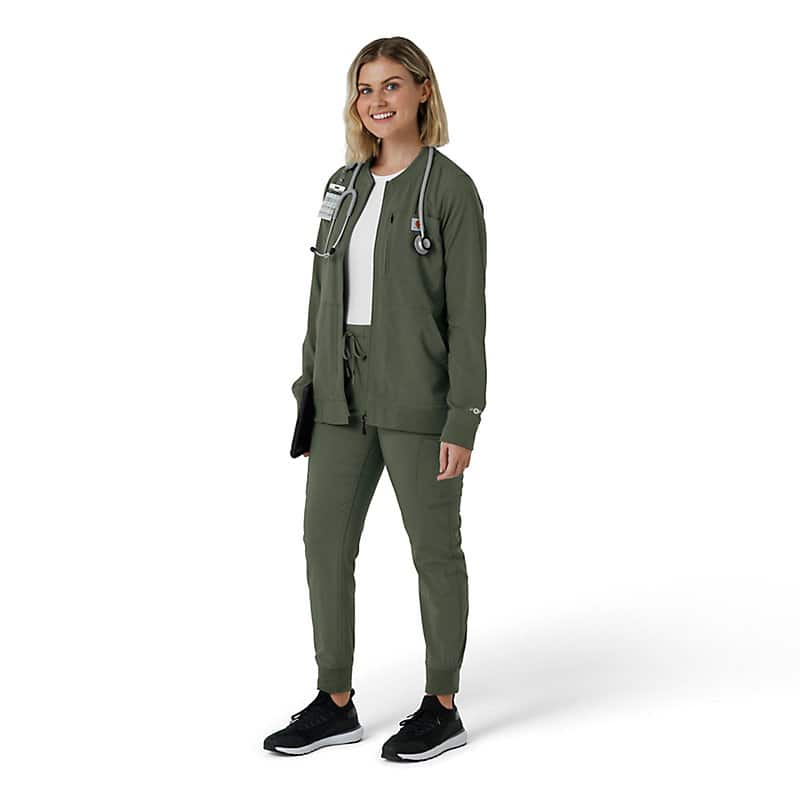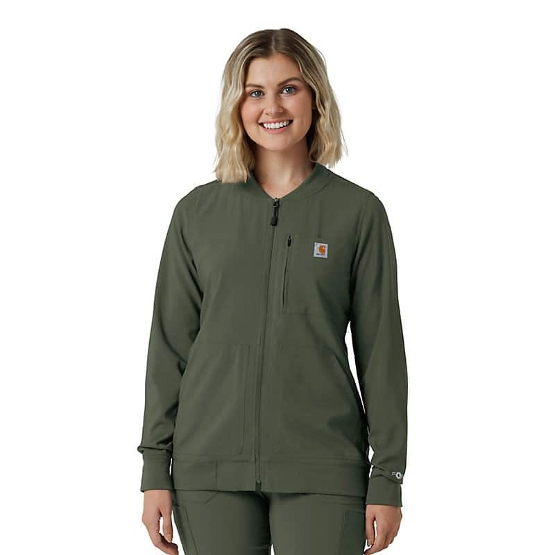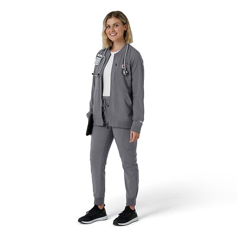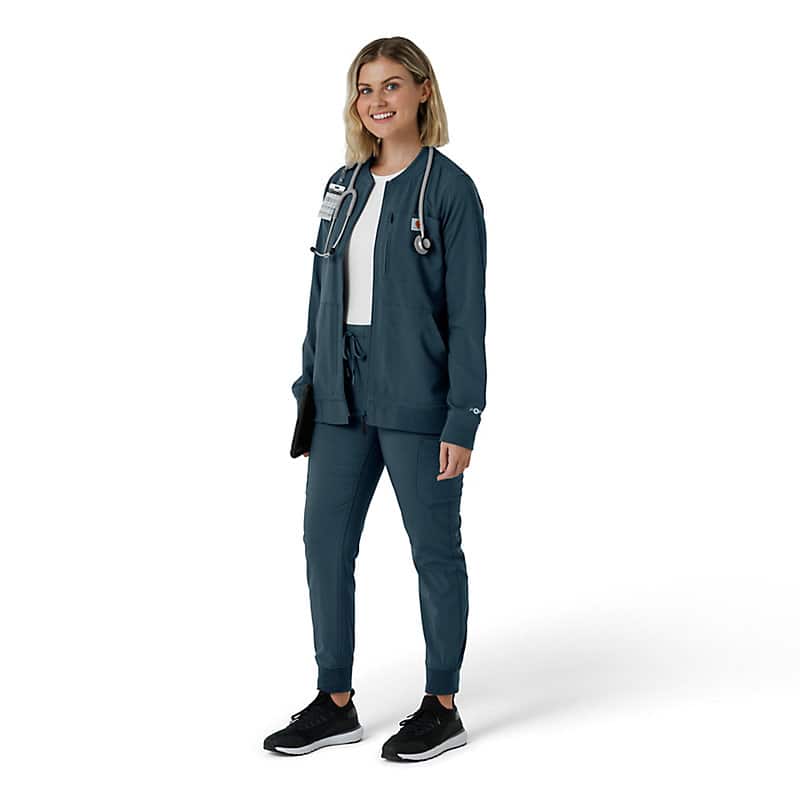 This women's Carhartt scrub jacket is a unique blend of classic workwear style and healthcare-specific functionality. At first glance, it resembles a traditional work jacket, but it's engineered to meet the unique demands of medical professionals. The Rugged Flex™ stretch fabric provides exceptional flexibility, allowing for unrestricted movement during busy shifts and demanding tasks. Functionality is a key focus, with a multitude of pockets strategically placed to keep essential tools and personal items organized and accessible. Notably, a dedicated stethoscope pocket ensures this crucial instrument is always within reach. The mesh-lined back vent promotes airflow, keeping you cool and comfortable even during long and strenuous periods. This jacket is designed to provide both durability and comfort. The robust construction ensures it can withstand the rigors of daily wear, while the thoughtful design div, such as the stretch fabric and ventilation, enhance overall comfort and performance. It's a reliable and practical choice for any healthcare professional seeking a durable and functional scrub jacket that can keep up with their demanding work environment.