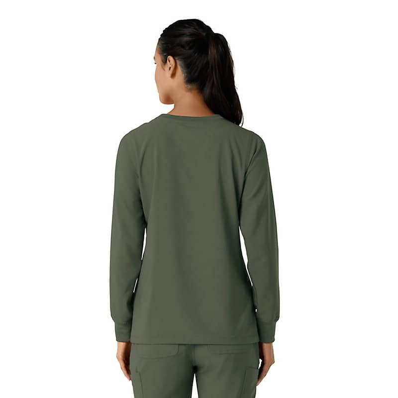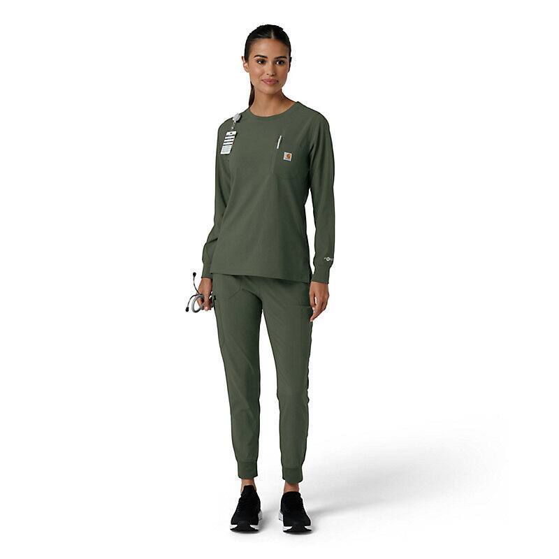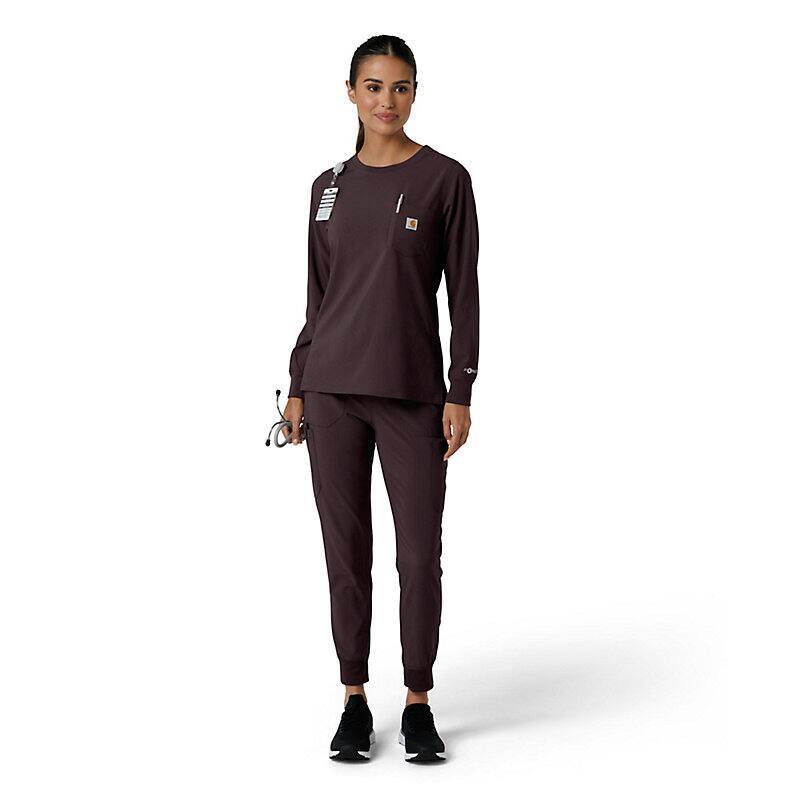 When you need a dependable layer for demanding workdays, this women's Carhartt long sleeve scrub top delivers. Designed for lasting comfort and functionality, it's a piece you'll consistently rely on. The durable fabric withstands the rigors of your shift, while the long sleeves provide added warmth and coverage. This scrub top is packed with practical features, including a zip pocket for storing small essentials. A dedicated pen slot ensures you're always prepared, and the badge loop allows for clear and visible display of your credentials. The knit collar and cuffs offer a comfortable, relaxed fit, adding a touch of casual style to your professional attire. This top seamlessly blends practicality with comfort, making it ideal for long hours on your feet. It's built to endure, ensuring you have a reliable and comfortable option for your daily workwear. The thoughtful design div and durable construction make this Carhartt long sleeve scrub top a valuable addition to any healthcare professional's wardrobe.